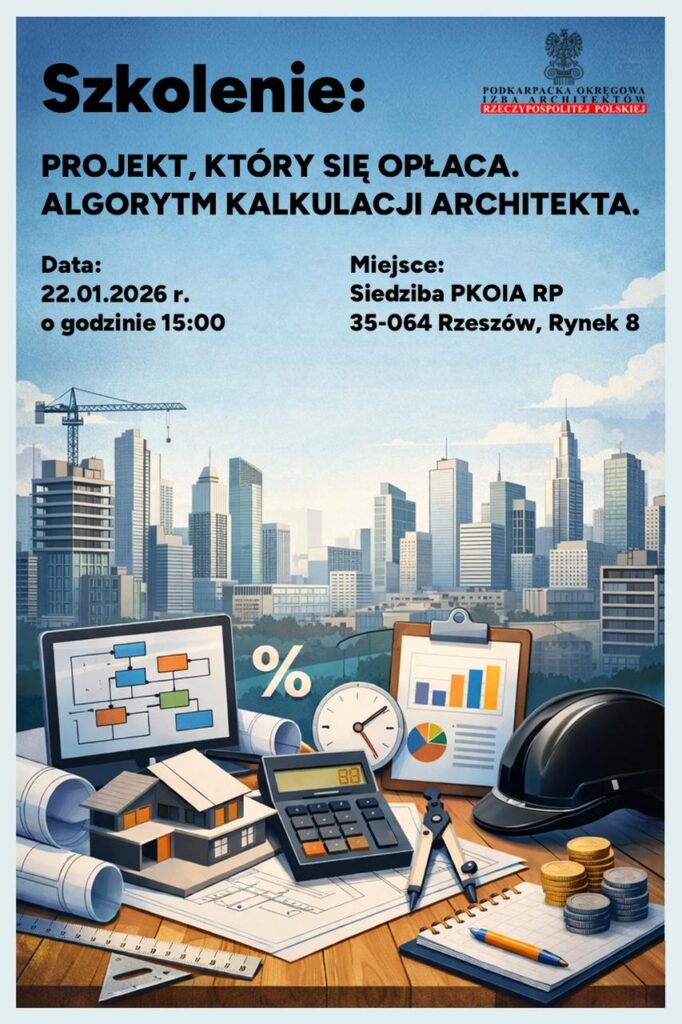 Podkarpacka Okręgowa Izba Architektów RP zaprasza na szkolenie poświęcone praktycznemu podejściu do wyceny prac projektowych i świadomego budowania wartości usług architekta.